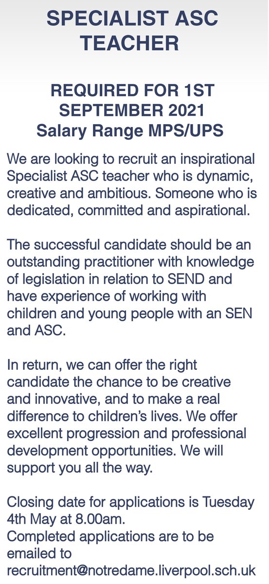 We are recruiting at @NDEvertonValley for a Specialist ASC Teacher to work within my team here. It is an exciting time to be joining the school and all information can be found here notredameliverpool.com/vacancies 🧠💫🌈 #edutwitter #SEND @sreddy100 @LPoolInclusion @Janroweljmu