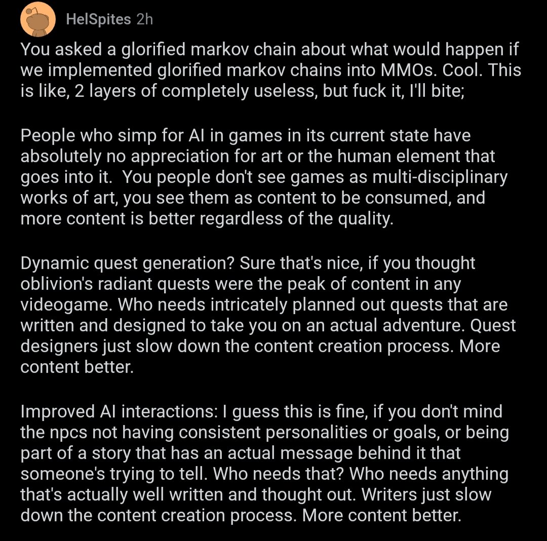 Someone on the r/MMORPG subreddit asked a LLM (large language model) what it thinks the potential for LLMs in MMOs would be. It gave predictable answers. And the current top comment gave one of the most succinct takedowns of "AI art" I have ever seen.