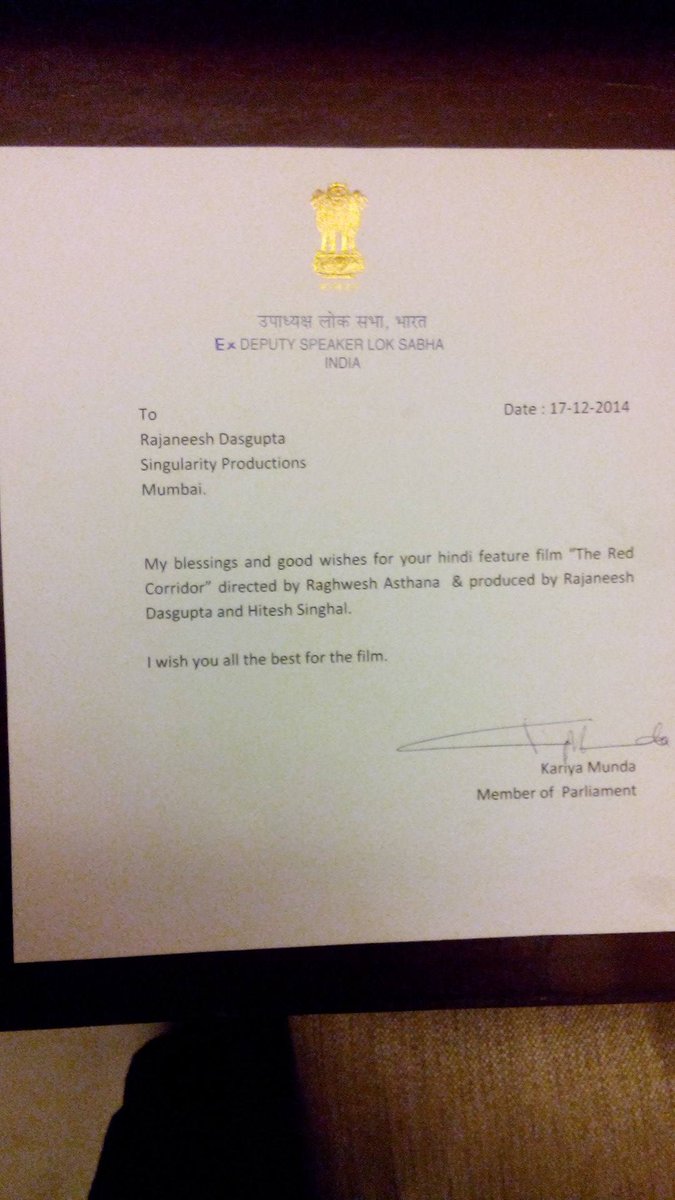 OUR FILM 'THE RED CORRIDOR' got Blessings of Shri Kariya Munda - Member of Parliament, Loksabha and ex-Deputy Speaker