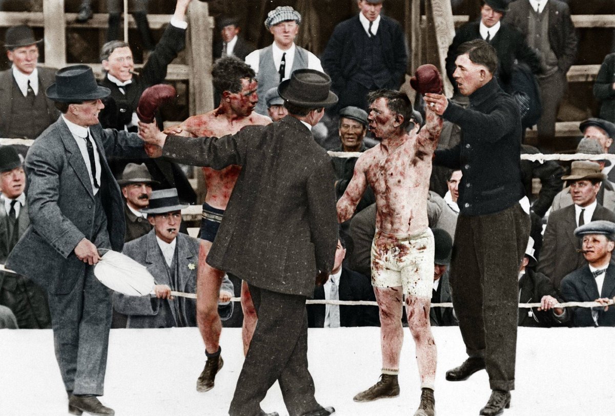 Colourized photo of a 1913 boxing match between Ray Campbell and Dick Hyland after 15 rounds (colourized by u/pillowymounds)