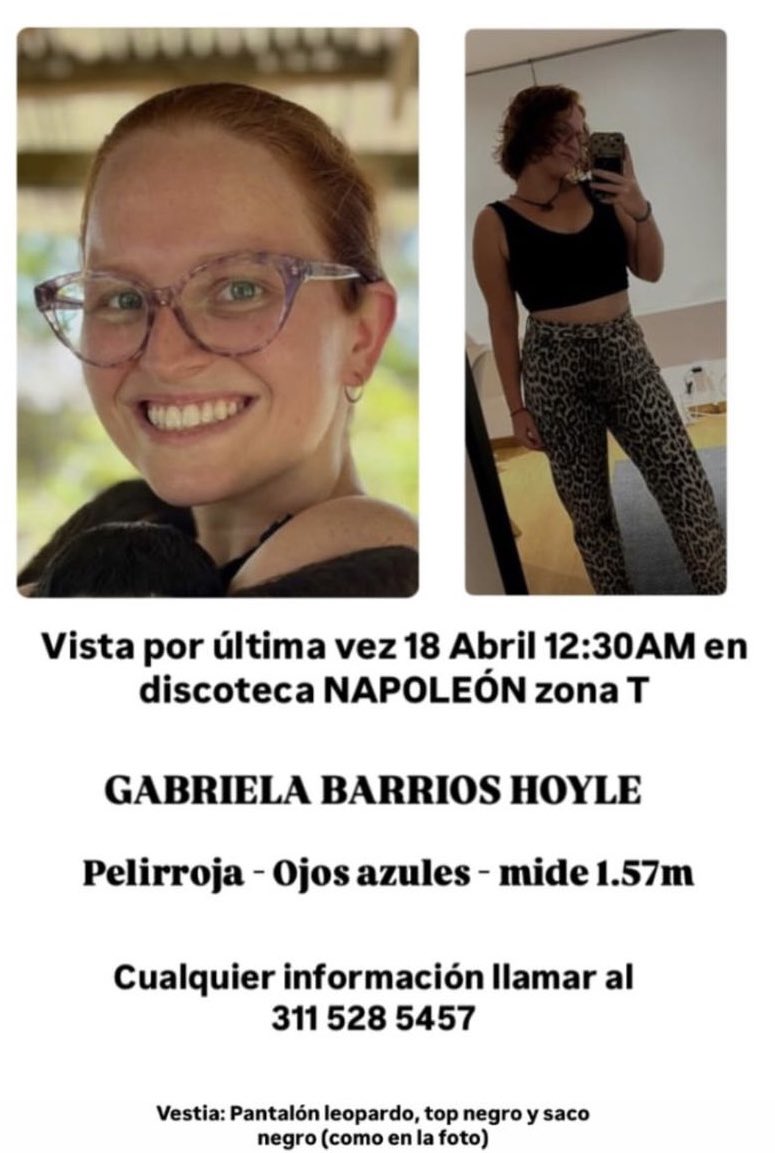 Por favor, ayudemos a encontrar a Gabriela Barrios Hoyle. La vieron por última vez en la Zona T, en Bogotá esta madrugada. Por favor ayudenme a compartir 🙏🏻