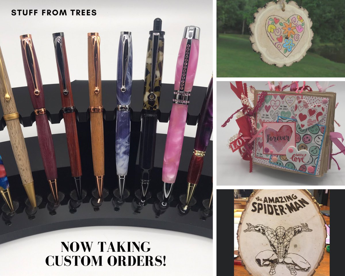 ‘Tis the season for thinking about Christmas gifts! Do your shopping in one place by starting a custom order with Stuff From Trees. Message us and give handmade, one-of-a-kind gifts this holiday season: start with pens, pencils, ornaments, wood burnings, cards, albums, journals.