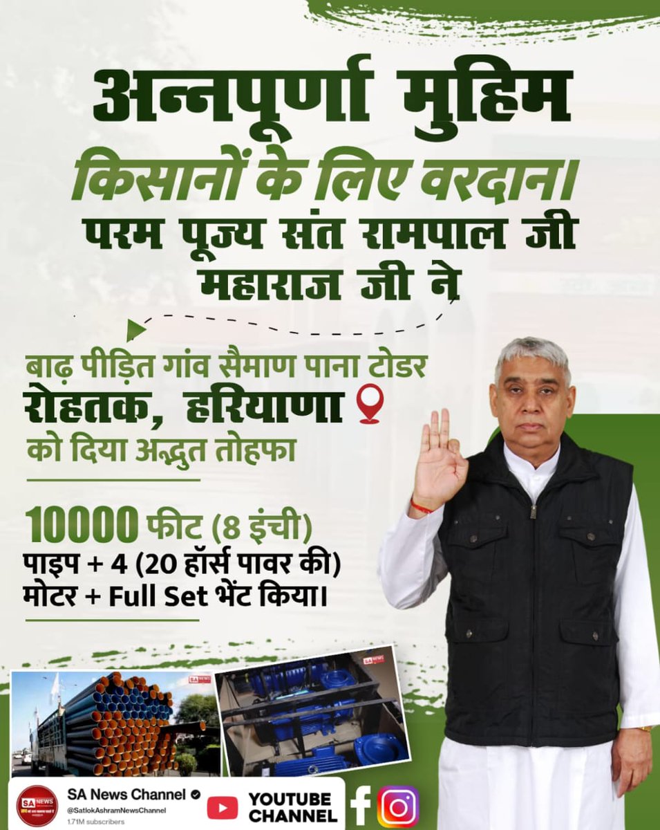 #AnnapurnaMuhim_बनी_वरदान बाढ़ प्रभावित गांव सैमान पाना टोडर, रोहतक (हरियाणा) के किसानों की मदद हेतु परम पूज्य संत रामपाल जी महाराज ने भेजा 10000 फीट पाइप, 4 (20 हॉर्स पावर) मोटर और पूरा सेट। यह अन्नपूर्णा मुहिम किसानों के लिए वरदान साबित हुई। Sa News YtChannel