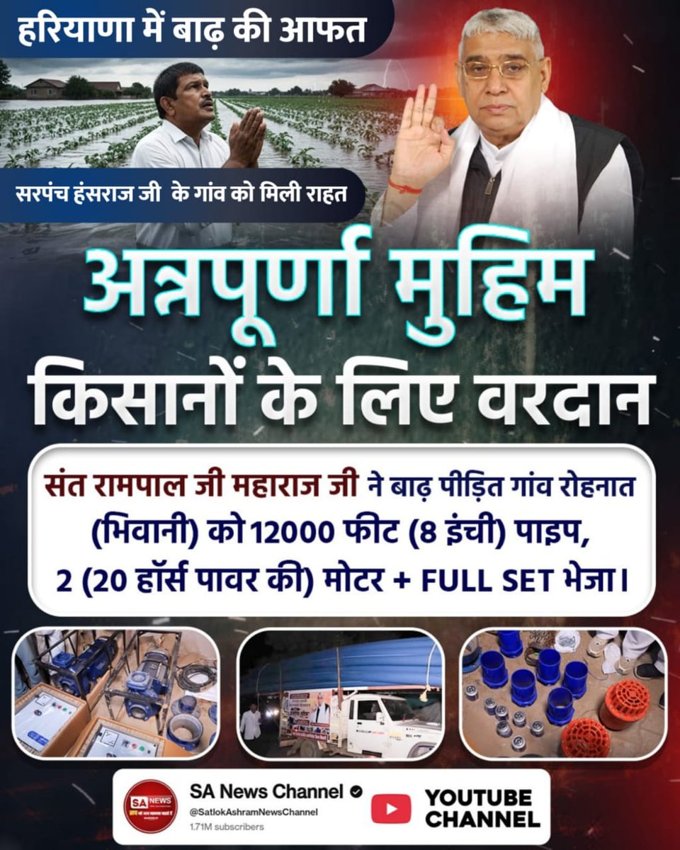 #AnnapurnaMuhim_बनी_वरदान संत रामपाल जी महाराज जी ने बाढ़ पीड़ित गांव को पहुंचाई राहत संत रामपाल जी महाराज जी ने दी मण्ढाणा गाँव (हिसार) को बहुत बड़ी राहत 10,000 फीट (8 इंची) 3 (20 हॉर्ष पावर) + Full Set Sa News YtChannel