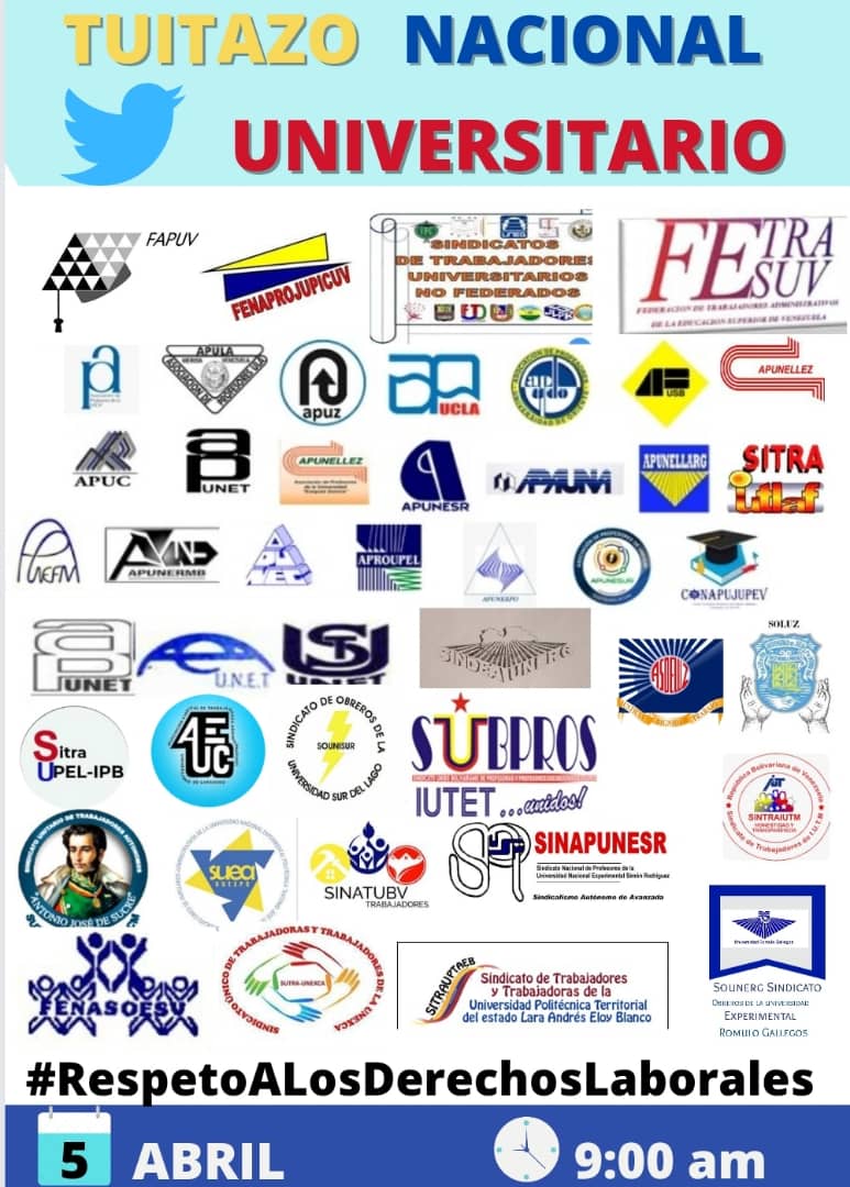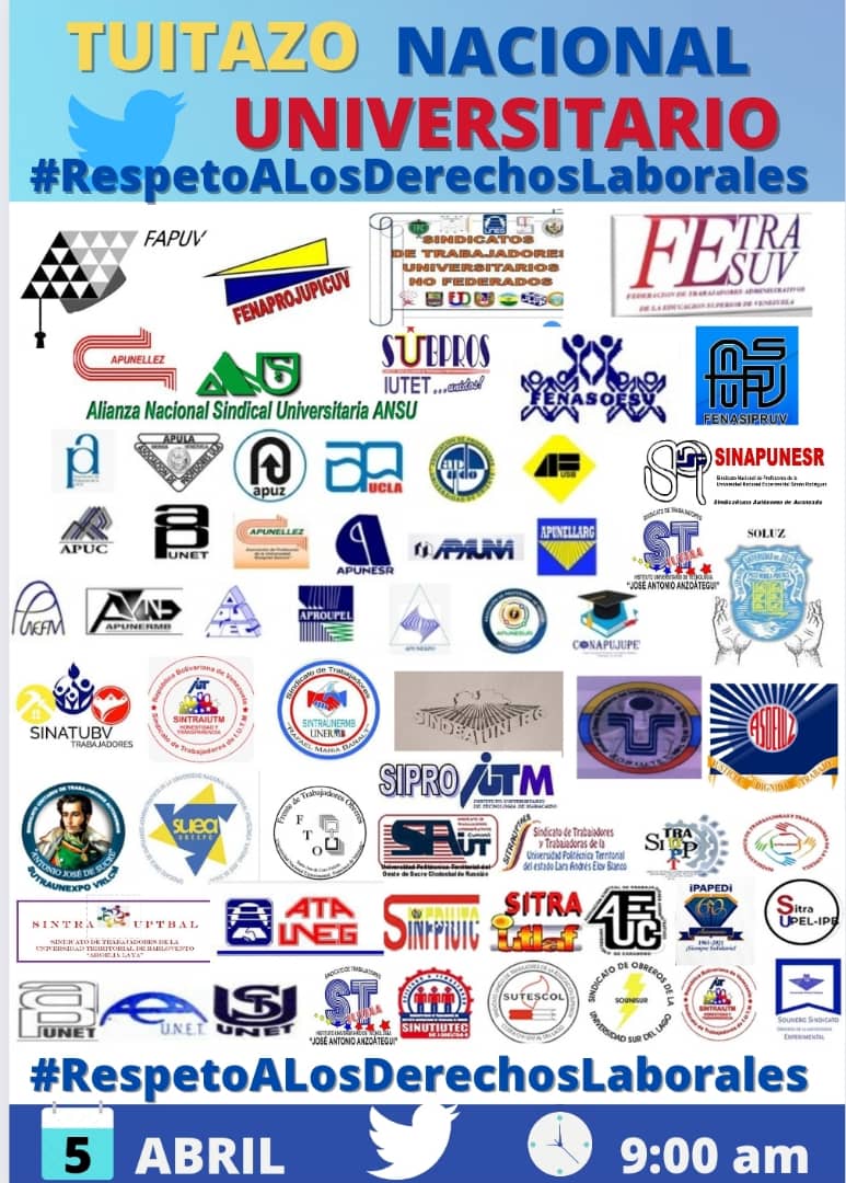 05Abr || Los Trabajadores Universitarios "Exigimos": #RespetoALosDerechosLaborales --- @OITAndina @NicolasMaduro @TibisayLucena8 @PresidencialVen @MPPEUVEN @mppeduniv @opsuVzla @delcyrodriguezv @Asamblea_Ven @ViceVenezuela