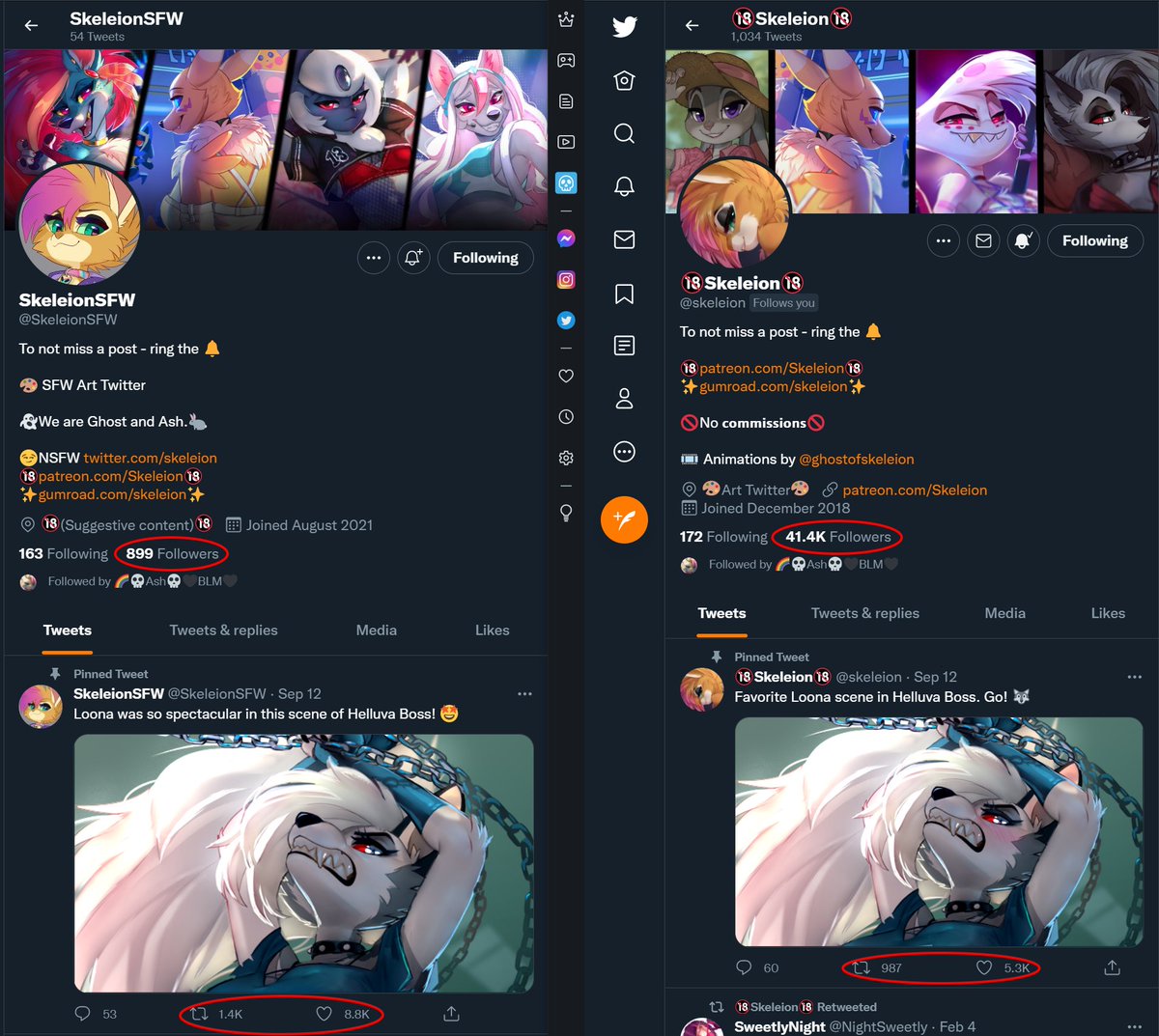 At the time of posting chain Loona we had less than 200 followers. Yet our 40k account received less likes/retweets. ΝSFW is being debооsted really badly right now. So it would help us a lot if you'd follow us @SkeleionSFW