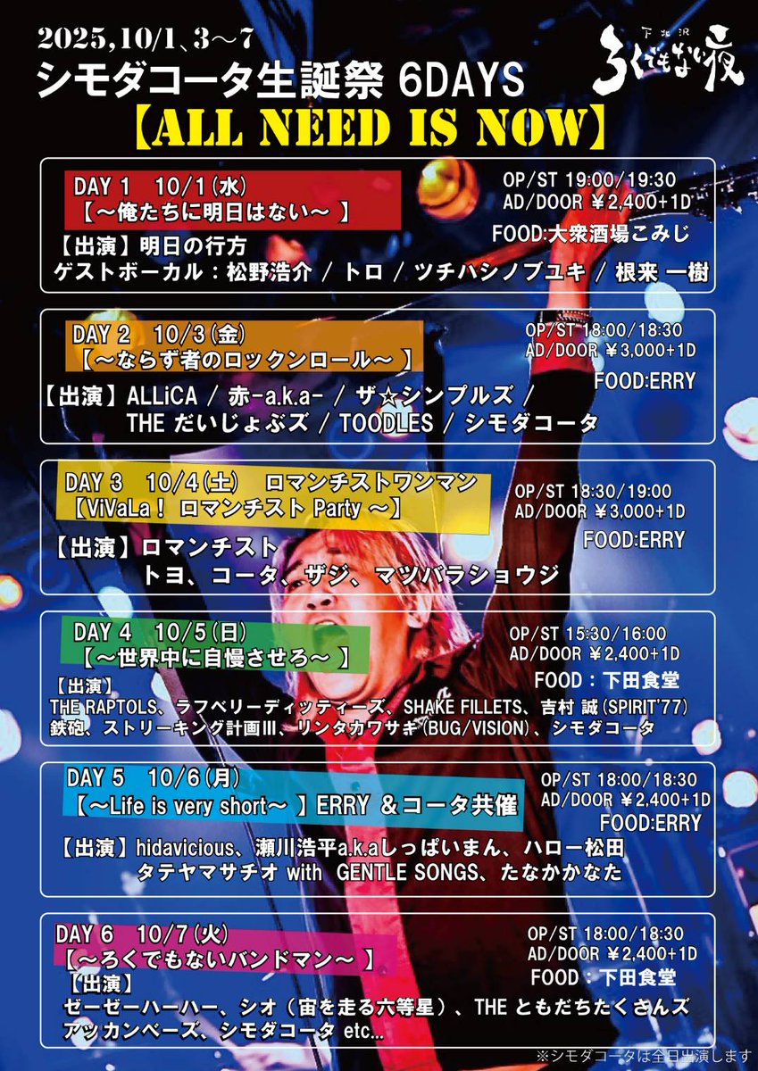 シモダコータ生誕祭6DAYS 【ALL NEED IS NOW】 無事終了しました! 全16ステージ、115曲 たくさんギター弾いて歌って、毎日朝まで打ち上げして夢のような時間でした。 出演してくれたバンドマン、見に来てくれたお客さんのお陰です。 心から感謝しています。…
