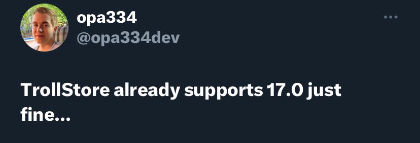 To install Trollstore: ✅ You can use Troll Helper for iOS 17 beta 1 to 5 and iOS 17.0 on iPhone 6 to X (A8 to A11 chips). ❌ But there's no way to install it on newer devices with A12 to A17 chips. cydia2.com/trollstore/