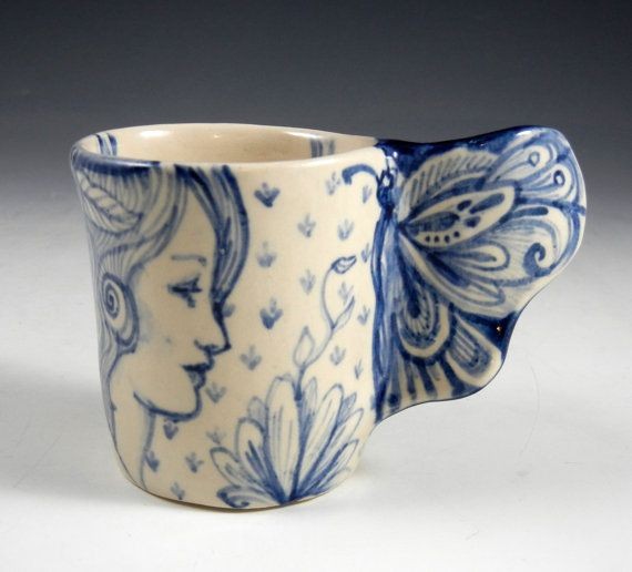 Me gustan estas tazas de porcelana azul y blanca.Hechas a mano,no hay ninguna igual a otra.Con esos mangos de mariposas o alas de aves ⬇️