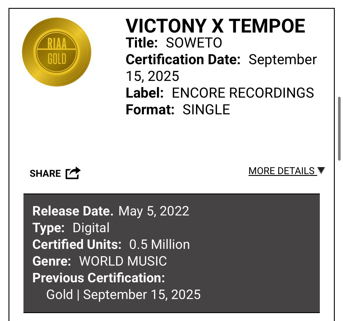 Tempoe earns his 3RD RIAA plaque with “Soweto” (w/Victony) as the song goes GOLD in the US 🇺🇸 Previous milestones: CKay – Love Nwantiti (8× PLATINUM) Omah Lay – soso (GOLD)