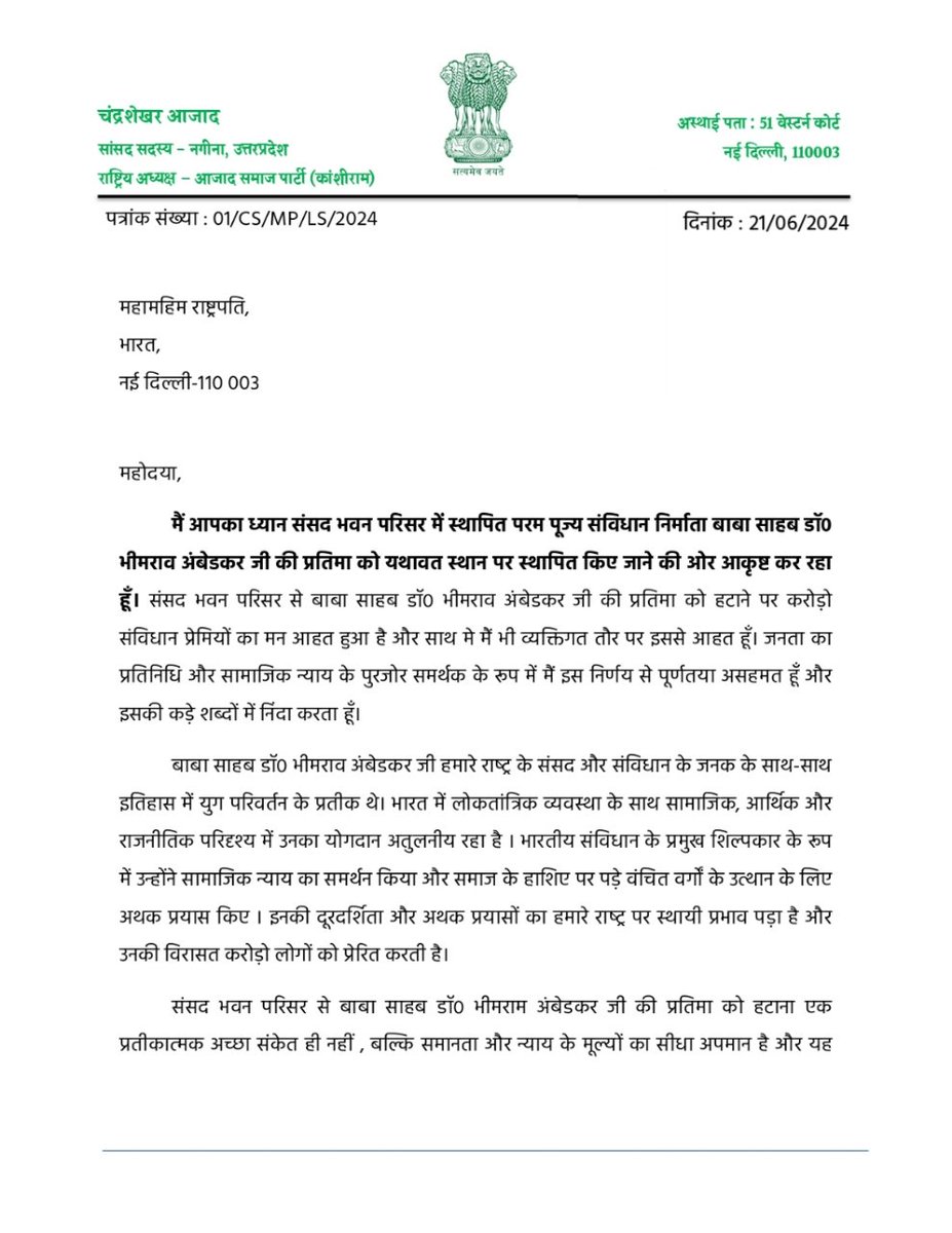 संविधान निर्माता परम् पूज्य बाबा साहेब डॉ० भीमराव अंबेडकर जी की प्रतिमा संसद भवन से हटाने से आहत हूं। मैं महामहिम राष्ट्रपति महोदया और माननीय लोक सभा अध्यक्ष जी से प्रतिमा को पुनः अपने स्थान पर लगाने की माँग करता हूं। बाबा साहेब अमर रहें। @rashtrapatibhvn @loksabhaspeaker