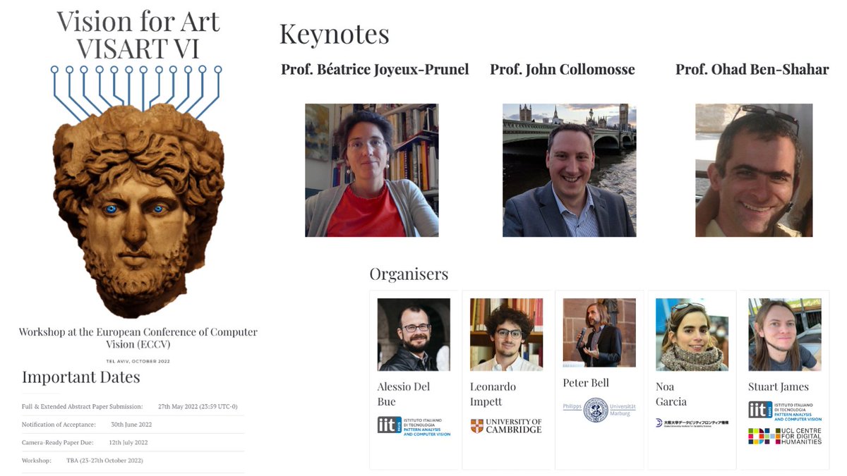 VISion for ART (#VISART) VI Workshop @eccvconf Details are out! Submit by: 27th May Full details at website: visarts.eu Fantastic keynotes from: - Béatrice Joyeux-Prunel (@JoyeuxPrunel) - John Collomosse (@JCollomosse) - Ohad Ben-Shahar (@ohad_ben_shahar)