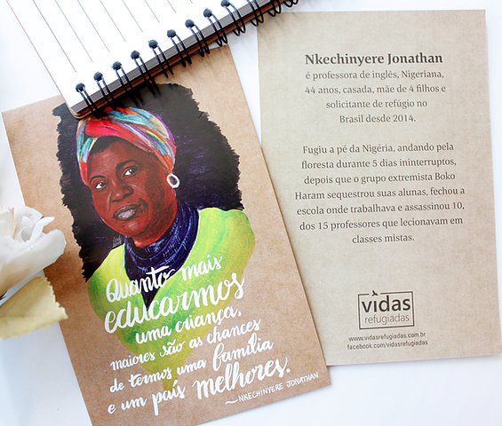 Os postais Vidas Refugiadas retratam mulheres que encontraram refúgio no Brasil. Compre aqui: cafecomchocolate.tanlup.com/product/112051…