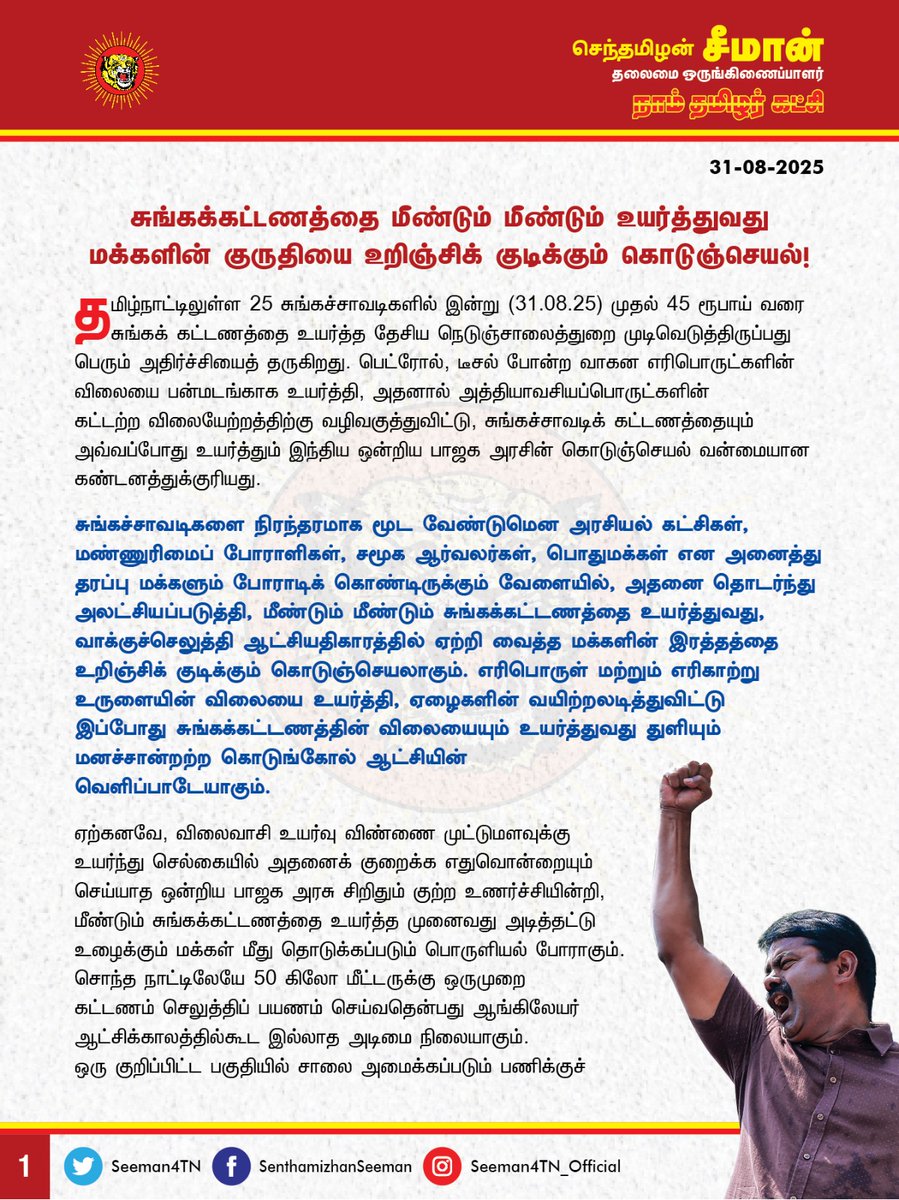 சுங்கக்கட்டணத்தை மீண்டும் மீண்டும் உயர்த்துவது மக்களின் குருதியை உறிஞ்சிக் குடிக்கும் கொடுஞ்செயல்! தமிழ்நாட்டிலுள்ள 25 சுங்கச்சாவடிகளில் இன்று (31.08.25) முதல் 45 ரூபாய் வரை சுங்கக் கட்டணத்தை உயர்த்த தேசிய நெடுஞ்சாலைத்துறை முடிவெடுத்திருப்பது பெரும் அதிர்ச்சியைத் தருகிறது.…