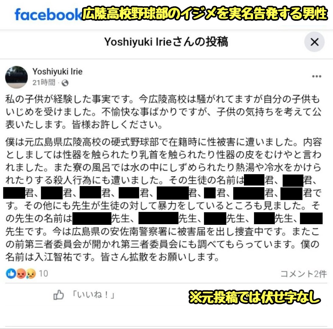 【実名告発】#広陵高校、新たなイジメ告発 ■被害生徒の主張 ・野球部先輩からチンポや乳首を触られ、チン皮を剥くよう命令された ・風呂に沈められたり熱湯をかけられた ・学校に報告したが証拠がなく「やってない」で逃げられた ・朝日新聞に相談するも門前払いされる (※朝日新聞は甲子園の主催者)