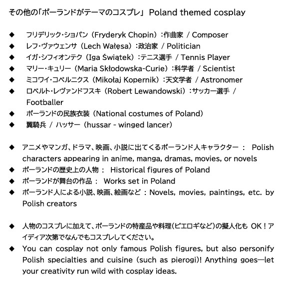 ヘタリアのポーランド TEKKEN8のリディア・ソビエスカ おやすみ、クマちゃん(こぐまのウシャテク) なども「ポーランドがテーマのコスプレ」です!アイディアを膨らませて、EXPO2025 ポーランド・ナショナルデー(10/1)のコスプレ・パレードとコンテストに参加ください。近日中にエントリー開始です♪