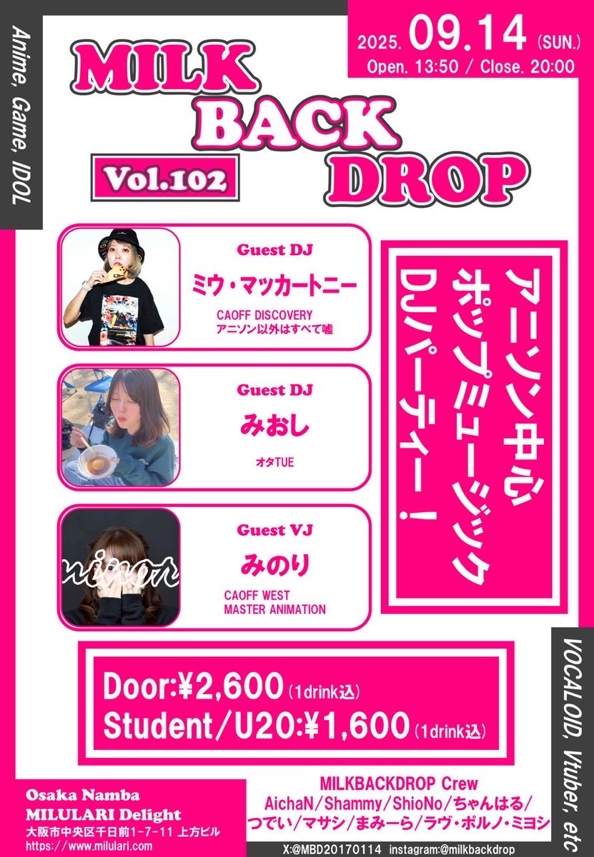 #MILKBACKDROP vol.102 【毎月開催!アニソンDJパーティー】 日時:9/14(日)昼 14:00〜 場所:なんばMILULARI Delight GUEST DJ ◤ミウ・マッカートニー ◤みおし GUEST VJ ◤みのり MBD始まって以来初、女性比率が多い回です フローラルの香りでお待ちしてます ⬇️詳細 twipla.jp/events/690180