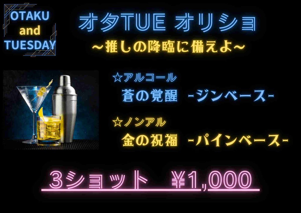 ✨🎉 OTAKU and TUESDAY 3rd Anniversary 🎉✨ 💙 #オタTUE 3周年限定 💛 オリジナルショット販売決定‼️ 飲酒組(蒼)もノンアル組(金)も 明日はみんなで乾杯🥃🥃🥃🤌🏻💖 推しの降臨に備えよ…!!!