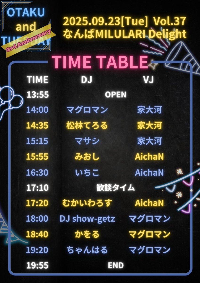 🎊🟦OTAKU and TUESDAY 3rd Anniversary 🟨🎊 📆9/23日(火)14時~ 🏙️なんば milulari Delight(大阪) 本日はオタTUE3周年回!! いろんなジャンルの曲が流れますのでアニソンも他の曲も好きな人はぜひ!! お隣で mojaさんが6時間DJしてるのでそちらもハシゴ割でぜひ〜 詳細は下記へ