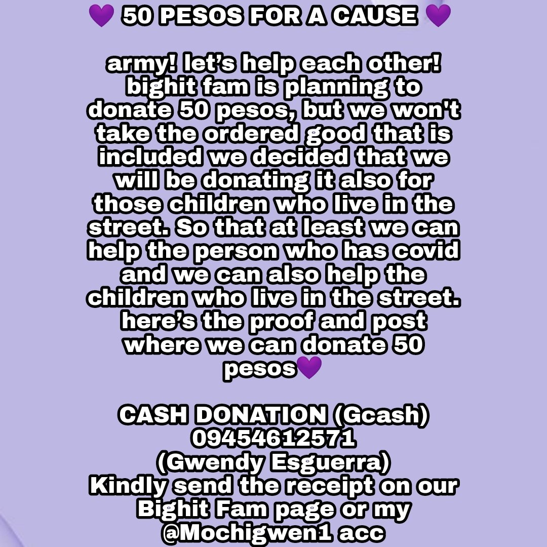 Hello Good afternoon everyone✨ We BighitFAMPhilippines are planning to do a donation and help ate Evelyn's Family!! We called it.. 💜50 PESOS FOR A CAUSE 💜 Also the ordered food that is included will be given to the childrens / people who live in the street!!🥰