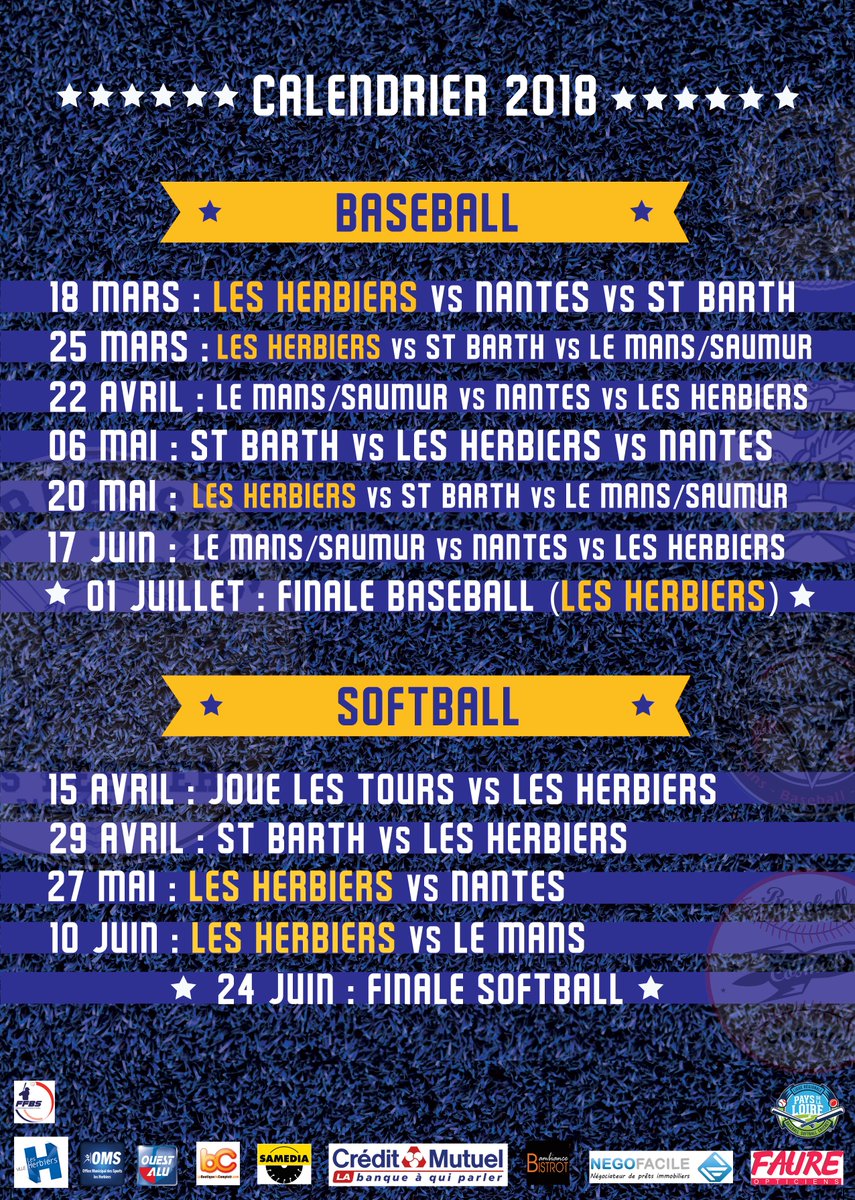 A vos agendas! voici le calendrier de la saison de #baseball et de #softballoutdoor ! Les dates en jaune se dérouleront sur le nouveau terrain synthétique du #stadeMassabielle à @lesherbiers . Entrée gratuite et bar sur place ! N'hésitez à venir nombreux et à partager au maximum!