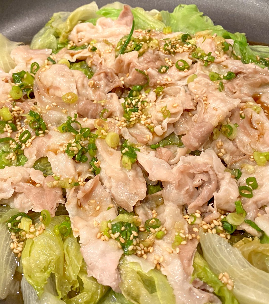 レタス1個をちぎって広げ、豚バラ200gをのせ酒大1入れ、中火で8分蒸し焼きにし、ポン酢大2、麺つゆ・ごま油・白ごま各大1、こねぎをかける。豚バラの旨みとレタスのシャキシャキ食感が絶品の一品。ご飯が進みます