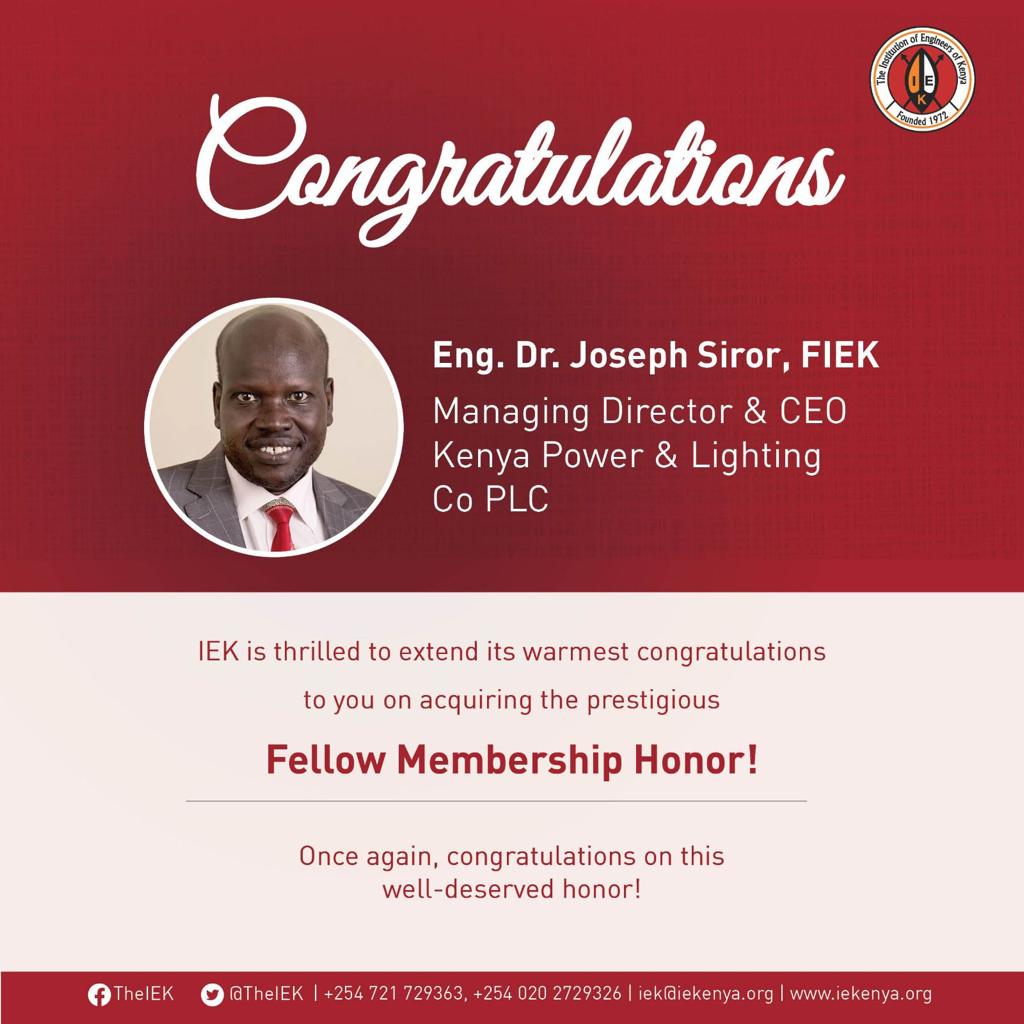 Please join us in applauding our very own MD & CEO, Dr. (Eng.) Joseph Siror for attaining the Fellow status at the @TheIEK, arising from his unwavering support and great contribution to the engineering profession and fraternity in Kenya and beyond. Kudos Eng.!