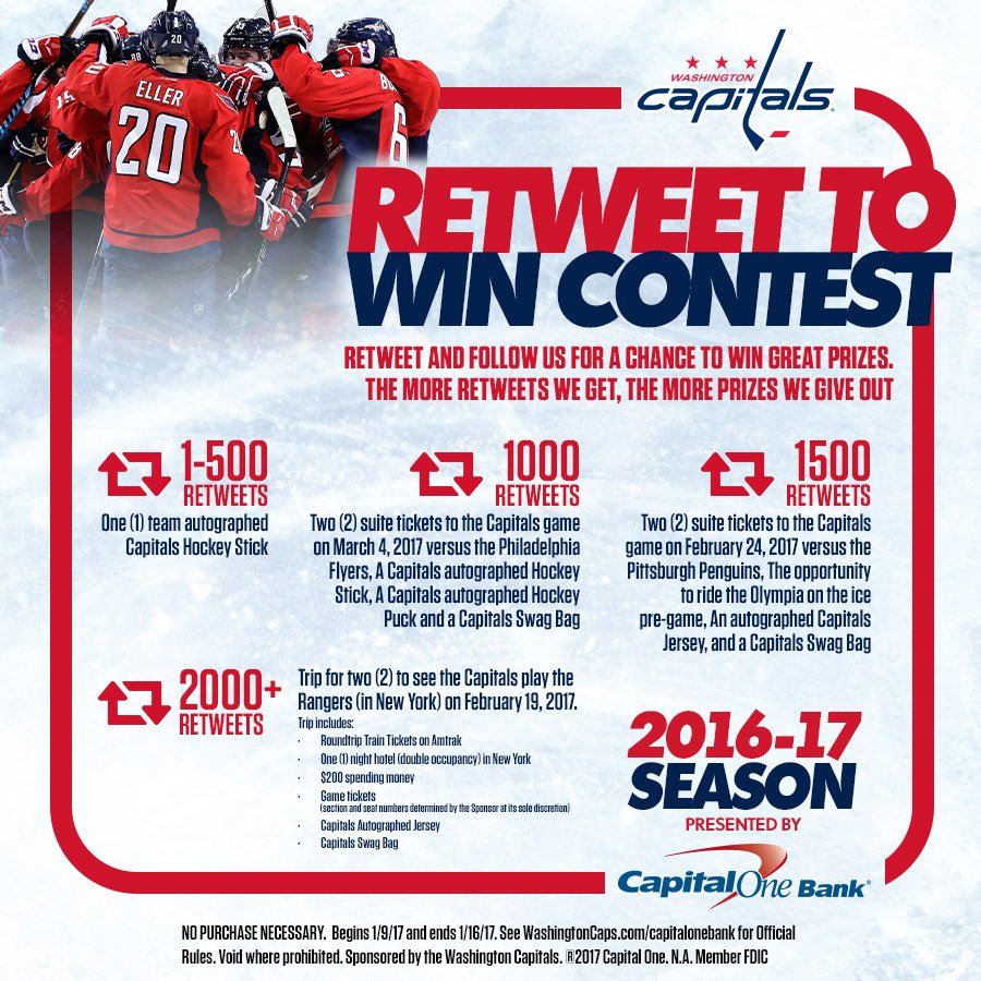 Retweet this Tweet to Win Great Prizes, thanks to @CapitalOne! More retweets we get, more prizes we give out! Rules: WashCaps.com/RetweetToWin