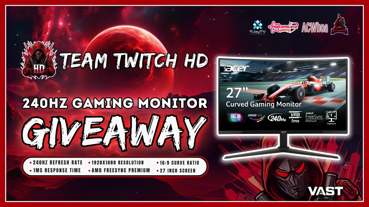 240Hz Gaming Monitor Giveaway! To enter, perform these tasks via the link below: 🔁 Retweet + Like ✅ Follow: @hotdropfps + @acwhoa + @PeachyKlutz + @VastGG Enter Here: tinyurl.com/Vast-TwitchTea…