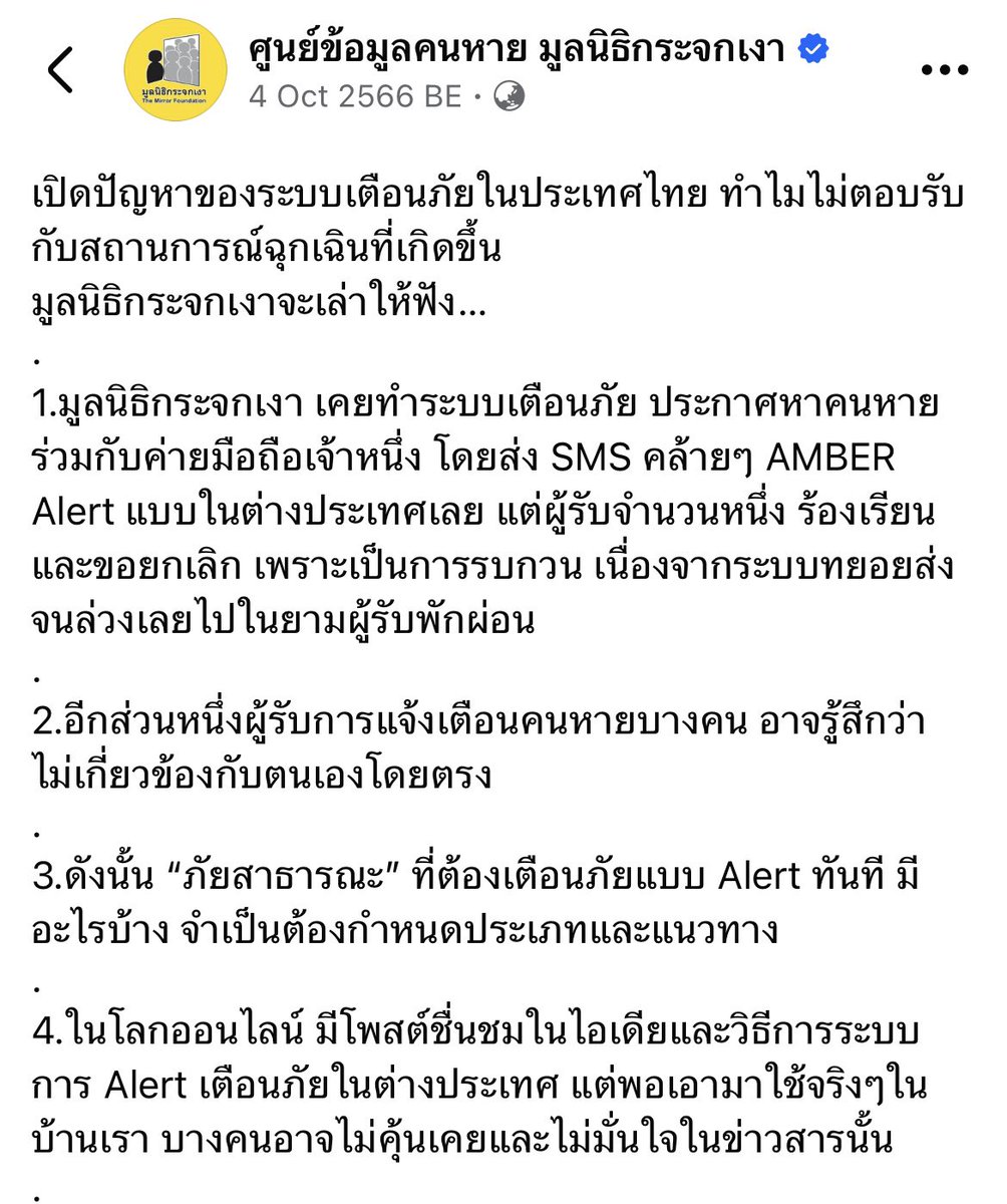 เล่าให้ฟัง~ นานมาแล้วมูลนิธิกระจกเงาทำ Amber alert หรือระบบแจ้งเตือนเด็กหาย โดยยิง SMS แจ้งลักษณะและรูปเด็ก เพื่อให้คนในชุมชนช่วยกันสอดส่องตามหา ยับยั้งการลักพาตัว ทีนี้พอใช้ในไทย เด็กหายกลางดึก ระบบแจ้งเตือนทันที โดนร้องเรียนให้ยกเลิก เพราะรบกวนเวลานอน บอกไม่ใช่เรื่องของเค้า https://t.co/yaAtCxsstG