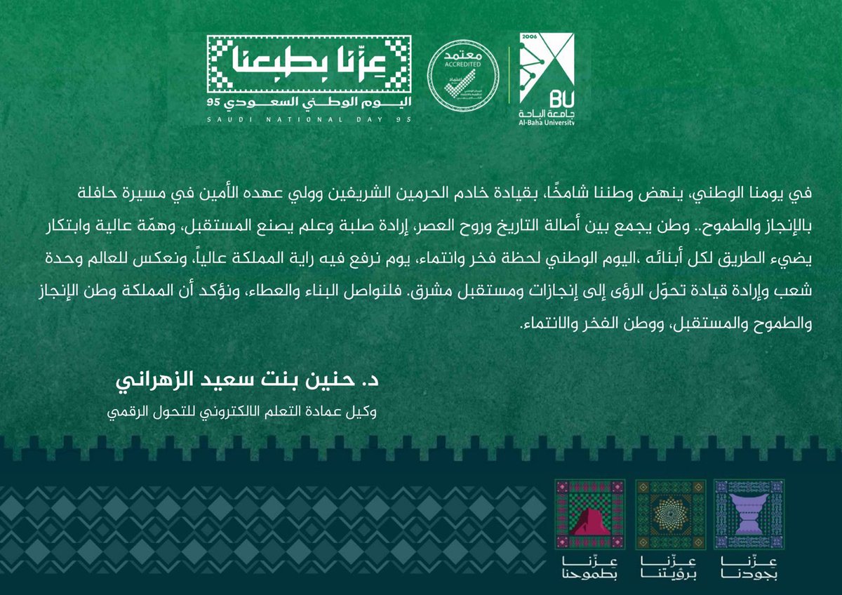 #فعاليات | #جامعة_الباحة | ✍️ | سعادة وكيلة كلية عمادة التعلم الالكتروني للتحول الرقمى د. حنين بنت سعيد الزهراني . #اليوم_الوطني_السعودي95 #اليوم_الوطني_95_جامعة_الباحة #عزنا_بطبعنا
