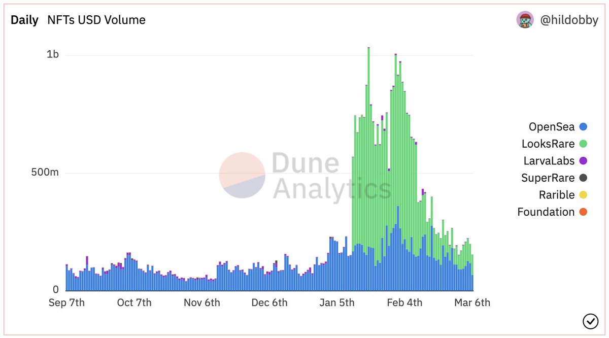 We see continuously decreasing of NFT volume after January. Should we be ready for new peak soon? Are you #bullish? Source: dune.xyz/hildobby/NFTs #NFT #NFTCommunity #NFTCollectors