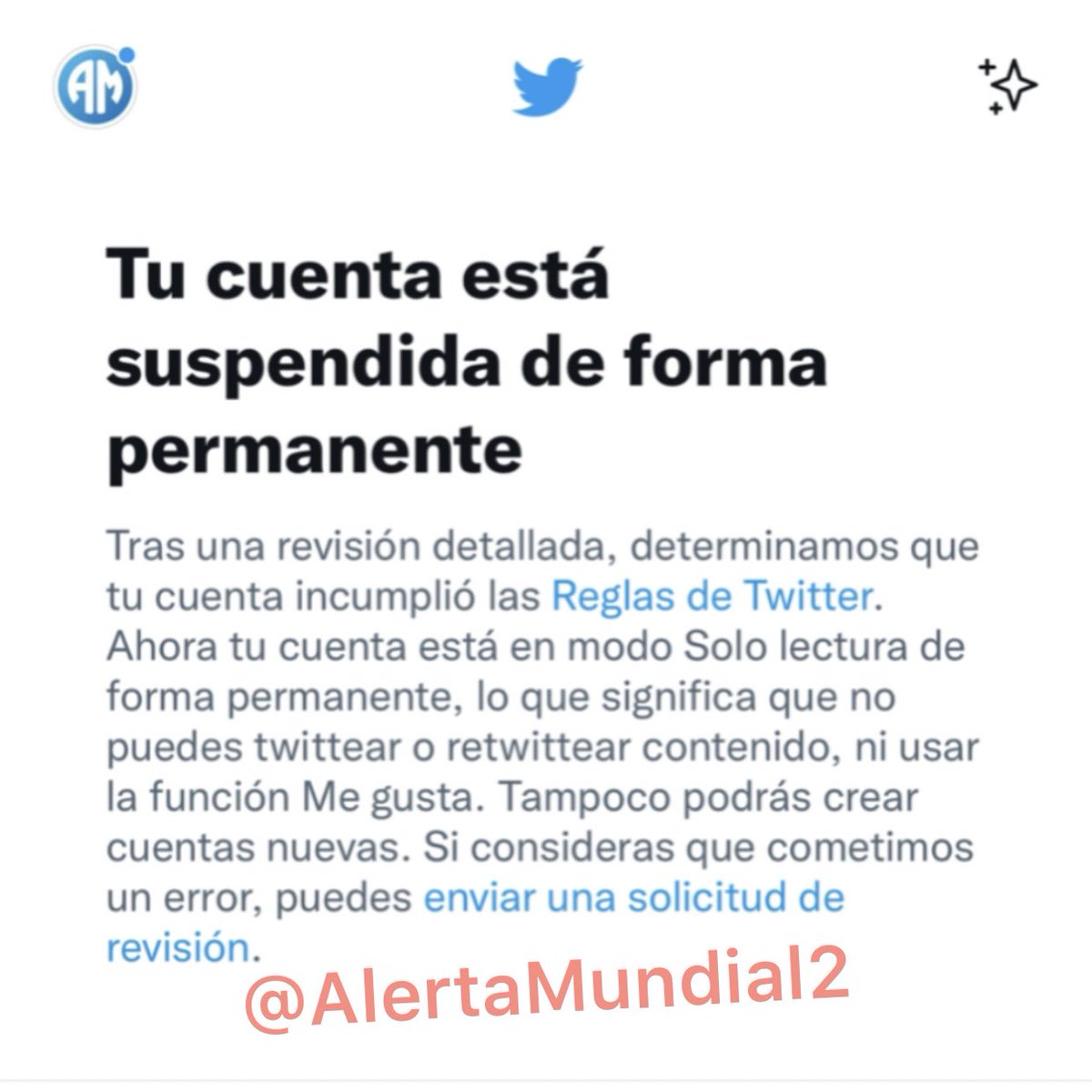 Buenas noches, queremos denunciar que nuestra cuenta @AIertaMundiaI fue suspendida permanentemente por Twitter. Teníamos más de 100k de seguidores (…) solo nos dedicamos a informar. Pedimos por favor nos devuelvan nuestra cuenta, ayúdennos a compartir @elonmusk