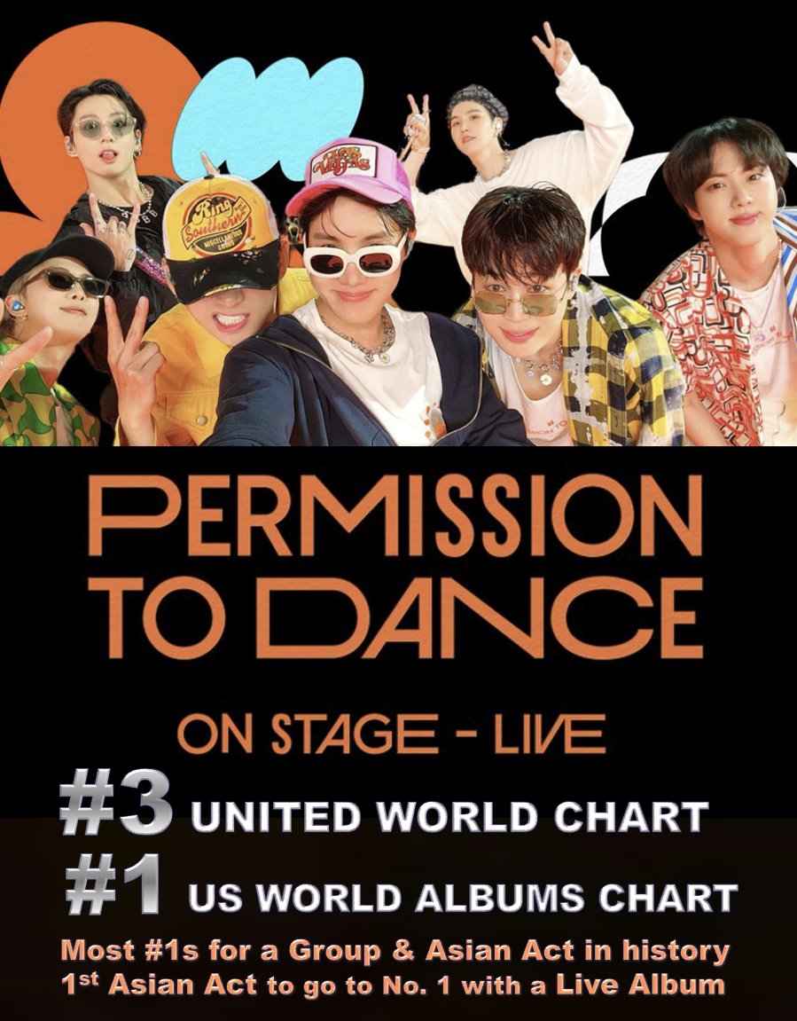 'Permission To Dance On Stage - Live', the first live album by the South Korean legendary Band #BTS, lands at #3 on this week's United World Chart with 173,000 equivalent sales points (35,000 points from streaming + 138,000 points from sales) and debuts at #1 on the Billboard…