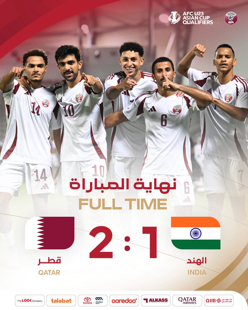 مباراة #العنابي 🇶🇦 الثانية في تصفيات #كأس_آسيا_تحت_23_سنة 🏆. ⚽️ | الهــنـــد 🆚 قــطـــر 🗓️ | السبت 06 سبـتـمبـر 2025 ⏰ | 20:00 (بتوقـيــت الدوحـة) 🏟️ | اسـتـاد عبدالله بــن خليـفــة