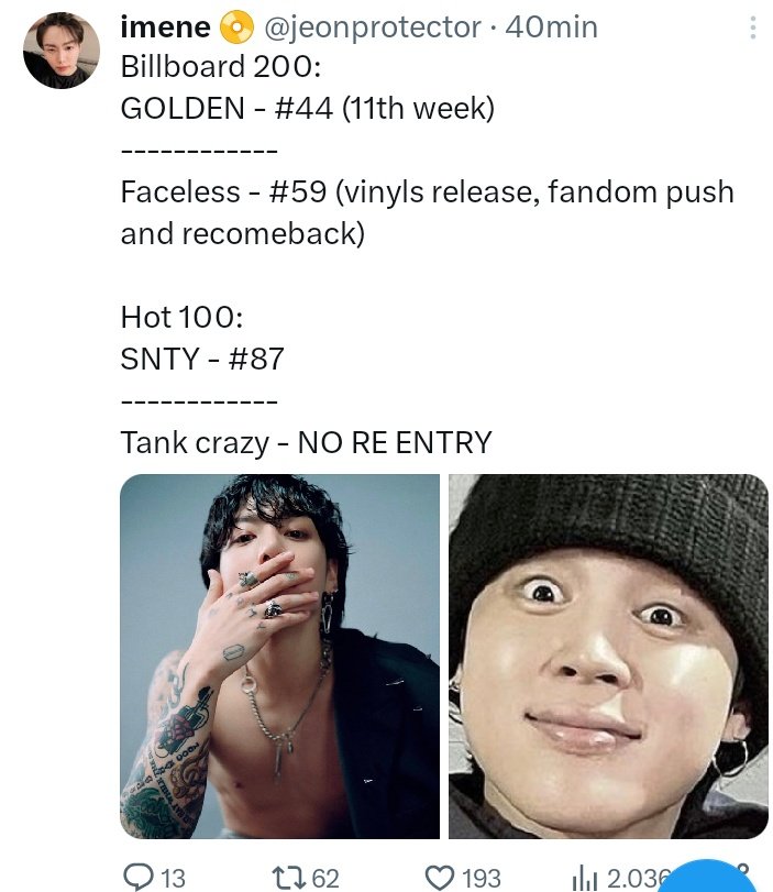 410 Followers 538 Following ♡For JIMIN #1 Billboard Hot 100 on 3 April, 2023♡ ☆Future IT Girl Gen 4th LEE HYEIN☆ ☆•••☆ fan acc focus jimin& hyein