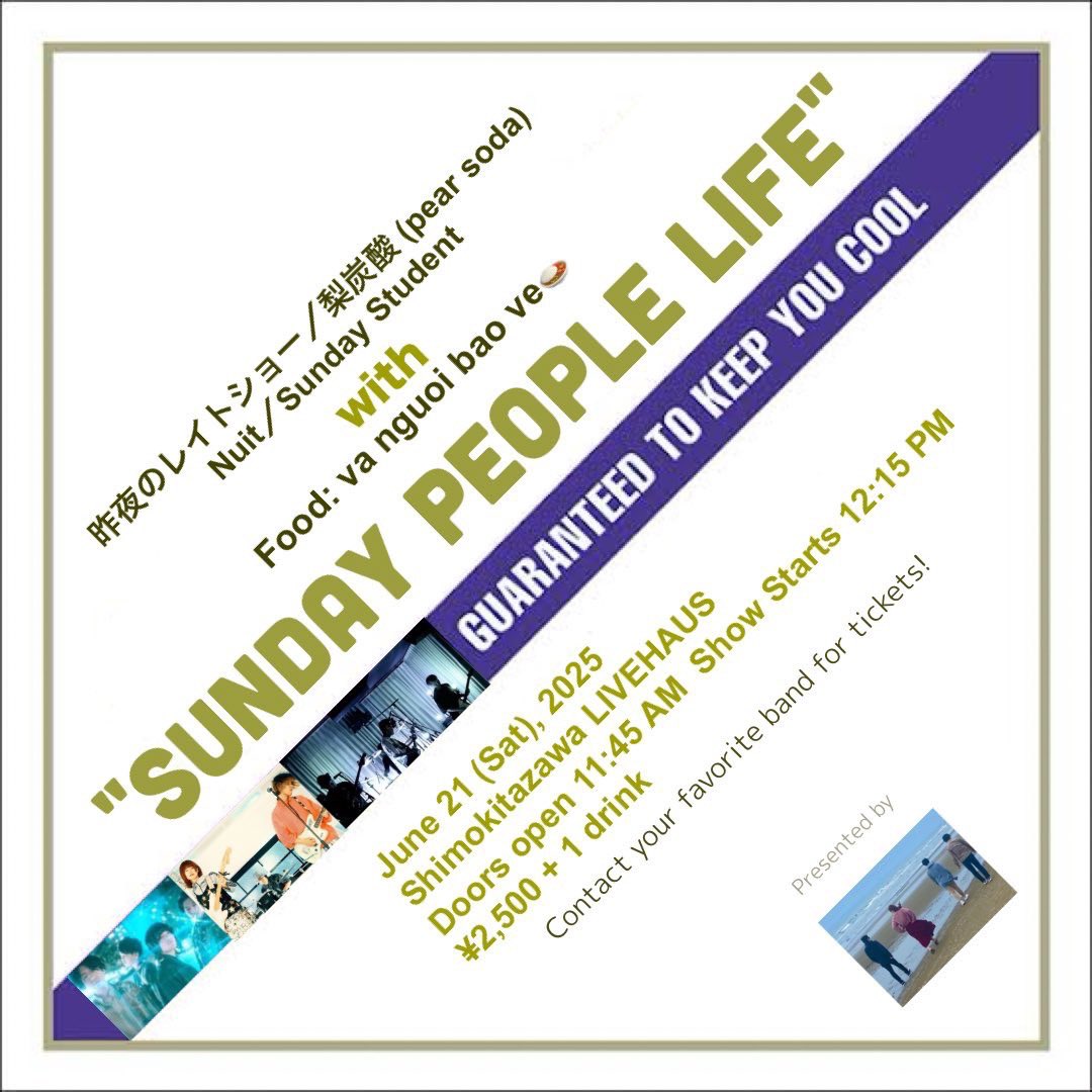 🎞️LIVEお知らせ🎞️ 久しぶりのライブ出演が決定! Gt.Vo. HANNAさん@flowerpose_ Syn.琴さん@ocoto___ 2名を迎えたフル編成。 残響音を溜め込んでお待ちしています。 2025/06/21(土)下北沢LIVEHAUS Sunday Student pre. "Sunday People Life" #2 Open 11:45 / Start 12:15 Ticket ¥2,500 +1 drink
