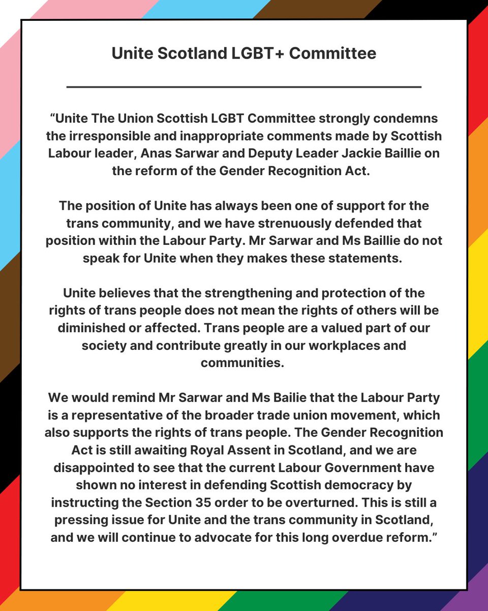 A statement from Unite Scotland's LGBT+ Committee on the comments made by Anas Sarwar on the GRA bill