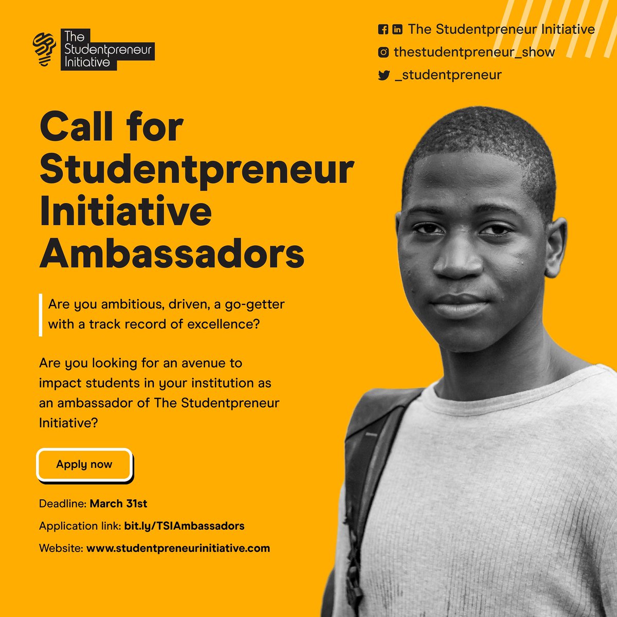 Opportunity for students! Here’s an opportunity to be a TSI ambassador at your institution. Application deadline is March 31st Link: bit.ly/TSIAmbassadors Retweet till this gets to every student you know. #studentopportunity #Studentpreneurinitiative