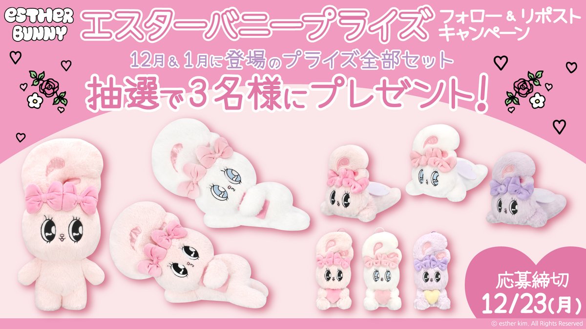 🐰エスターバニー🐰 🎀フォロー&リポストキャンペーン🎀 #エスターバニー プライズ展開を記念し プライズ4アイテム(9種)をセットで3名様にプレゼント🎁🎊 応募はカンタン💗 ①@FURYU_prizeをフォロー ②この投稿をリポストor引用 詳細は➡️f-ch.jp/estherb_cp #フリュープライズキャンペーン