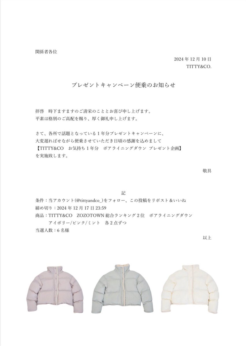 大変遅ばせながら 話題の1年分プレゼント企画に 便乗いたします🌲🎅🏻 当アカウントをフォロー+この投稿をリポスト&いいねで応募完了🪄 お気持ち1年分、ZOZOTOWN総合ランキング2位、話題のボアライニングダウンをお届けします💖 #プレゼントキャンペーン #クリスマスプレゼントキャンペーン