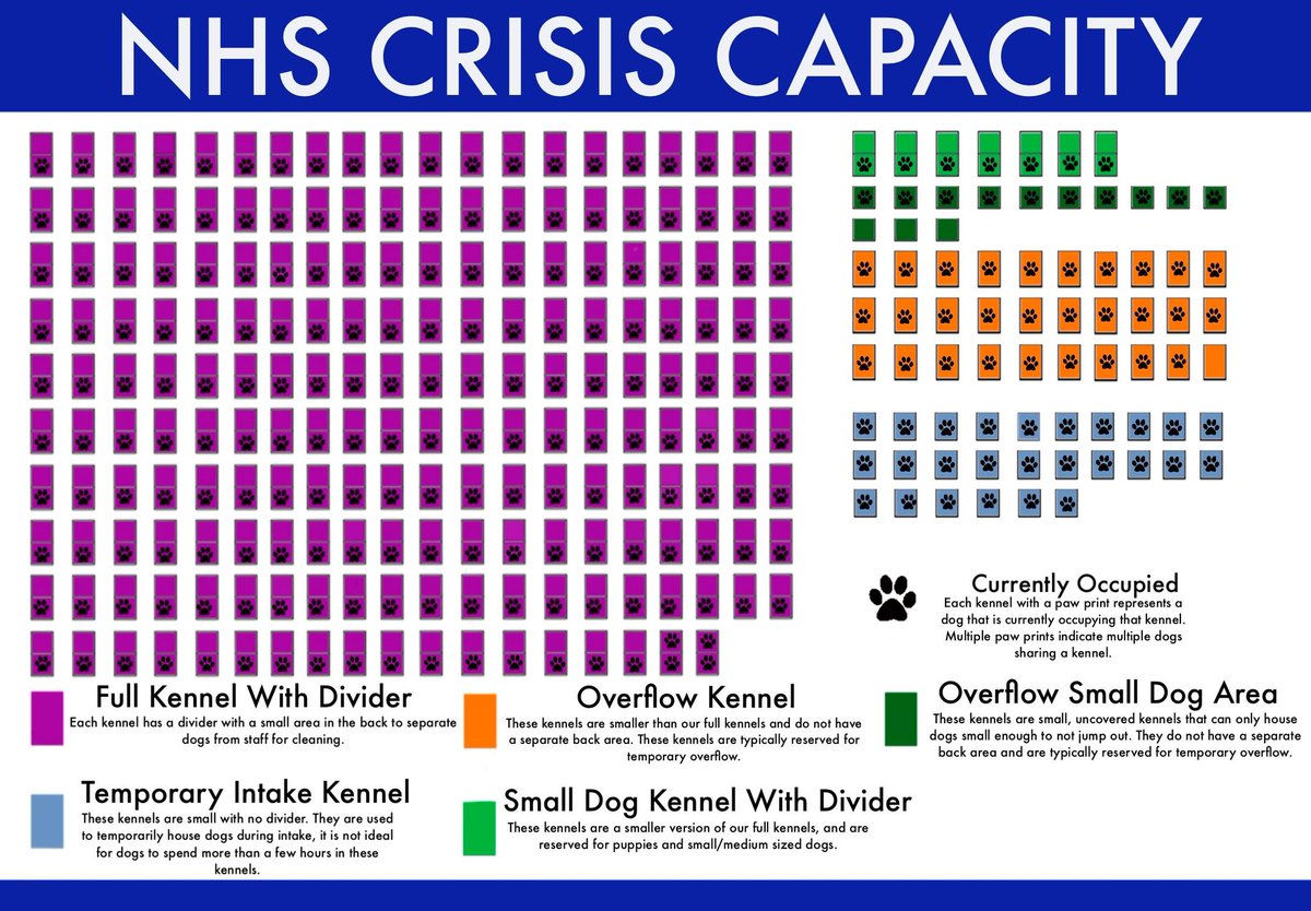 NHS is in the midst of a crisis. We've been squeaking by for several months, but now we're literally OUT of space. It's urgent that we move dogs out of kennels ASAP. We have 274 total kennels, including 46 "overflow" kennels. We currently have 272 dogs in kennels.