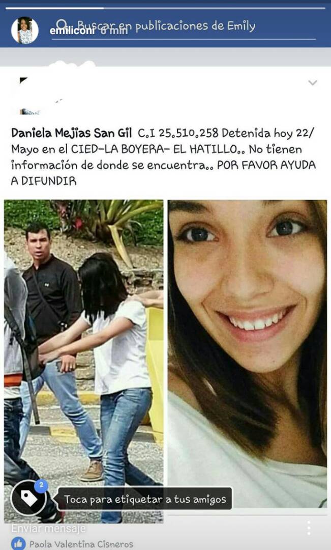 FUE DETENIDA, PERO NO SE SABE DÓNDE SE ENCUENTRA: Daniela Mejias San Gil CI 25.510.258 #CIED #ElHatillo #22Mayo2017 #DDHH @PorHumanidad