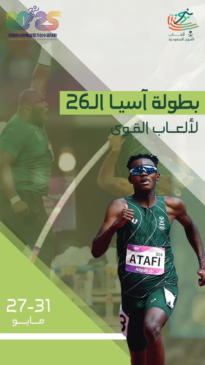 ترقبــوا مشاركة أبطالنا في بطولة آسيا الـ26 لألعاب القوى، والتي تنطلق في مدينة غومي بجمهورية كوريا الجنوبيه خلال الفترة من 27 إلى 31 مايو! جاهزين بمشيئة الله لتمثيل الوطن في هذا المحفل الاسيوي الكبير وتحقيق الانجازات🏅🇸🇦🏅 #ألعاب_القوى #السعوديه #الطريق_إلى_الذهب