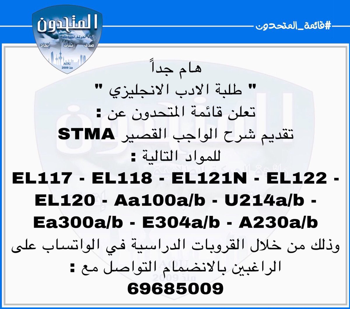 317 Followers 48 Following الحساب الرسمي لـ لجنة تخصص اللغة الانجليزية وآدابها بـ #قائمه_المتحدون في الجامعه العربيه المفتوحه ، للمسـاعده أو الاستفسـار تواصـلو معانا 69685009💙