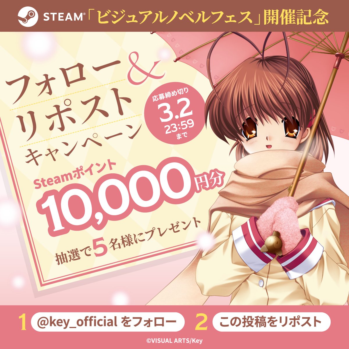 【お知らせ】 2025年3月4日~11日 Steam「ビジュアルノベルフェス」開催記念 \フォロー&リポストキャンペーン/ 抽選で5名様に Steamポイント10,000円分プレゼント! 🎁応募方法 ① @key_official をフォロー ②本投稿をリポスト ※応募期間は3月2日(日)23:59まで