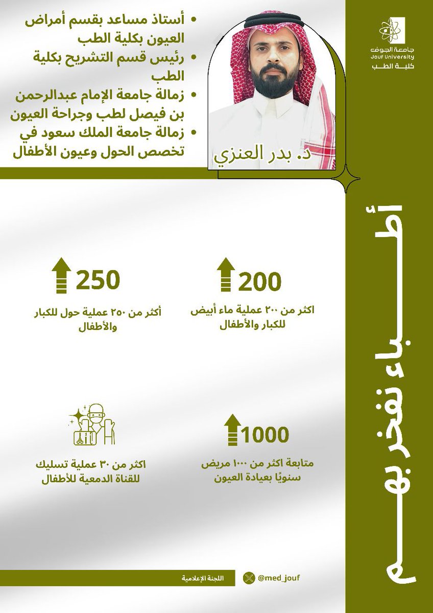 1K Followers 896 Followingاستشاري الطب الوقائي والصحة العامة، زمالة في إدارة طوارئ الصحة العامة ، ودبلوم في طب الحشود والكوارث ، وماجستير في ادارة الخدمات الصحية