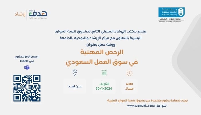يعلن مركز الإرشاد والتوجيه بـ #جامعة_الملك_سعود وبالتعاون مع مكتب الإرشاد المهني التابع لصندوق تنمية الموارد البشرية عن إقامة ورشة عمل بعنوان: "الرخصة المهنية في سوق العمل السعودي" يوم غدٍ الثلاثاء 30 يناير. رابط الدخول: 2u.pw/fswDF9M