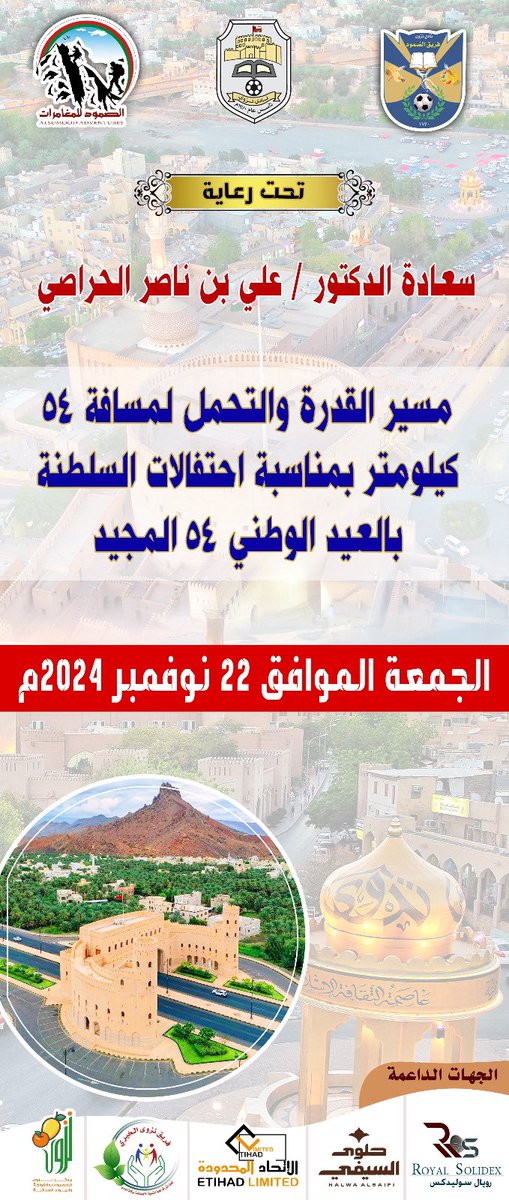 أتشرف يوم الجمعة 22 نوفمبر 2024 بقيادة مسير طويل للقدرة والتحمل لمسافة 54 كيلو متر بمناسبة العيد الوطني وسوف يمر المسار على اهم المواقع السياحية بالولاية منها سوق نزوى والقلعة وحارة العقر . يرعى الختام سعادة الدكتور / علي بن ناصر الحراصي عضو مجلس الشورى.