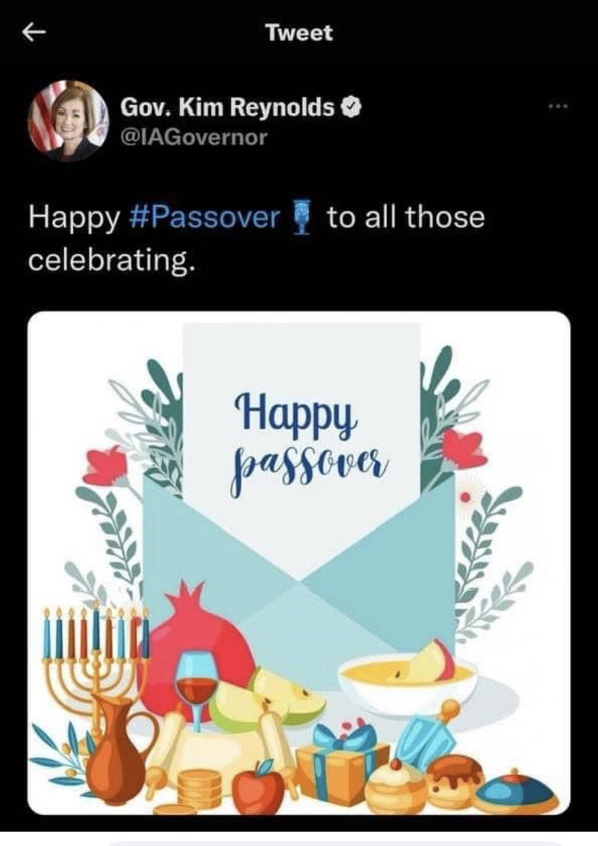 Iowa Governor Kim Reynolds tweeted this out. There are many symbols of Passover. None of these are them. Details matter.
